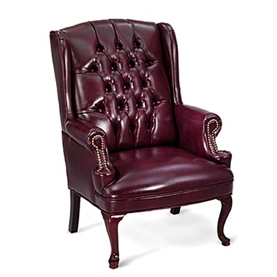 Traditional styling with button tufting and brass nailhead trim. Padded arms. Deep cushioned vinyl upholstery in Oxblood burgundy. Genuine hardwood frame with a rich mahogany finish. Queen Anne style legs. Seat: 19w x 19d. Back: 21w x 27h. Overall height: 39". NO ASSEMBLY REQUIRED. Meets or exceeds ANSI/BIFMA standards. Manufacturer’s five-year limited warranty. Shpg. wt. 53 lbs. (Cannot ship UPS.) |