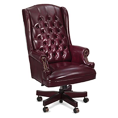 Traditional styling with button tufting and brass nailhead trim. Padded arms. Deep cushioned vinyl upholstery in Oxblood burgundy. Genuine hardwood frame with a rich mahogany finish. Five-star steel base with mahogany finish, hardwood caps and brass hooded casters. Casters supplied with the chairs are not suitable for all floor types. Alternative casters are available to meet your specific needs. Pneumatic seat height adjustment; 360° swivel and tilt tension control. Seat: 19w x 17-3/4d. Back: 19w x 31h. Overall height: 44-1/2" to 47". NO ASSEMBLY REQUIRED. Meets or exceeds ANSI/BIFMA standards. Manufacturer’s five-year limited warranty. Shpg. wt. 68 lbs. (Cannot ship UPS). |