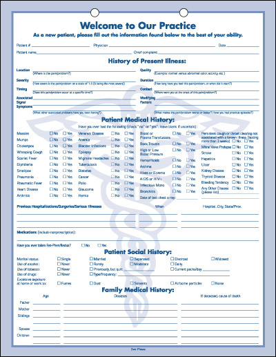 Welcome Form Clinical (Caduceus) Lt-Blue Welcomes patients with a friendly first impression. Clinical form easy to read and fill out. Includes personal information, and insurance sections. Printed both sides in light blue. 100 forms per package. Overall size 8-1/2" W x 11" H. SKU: CF17659 Unit of Measure: PCKG Color: Light-Blue Quantity: 100/Pkg