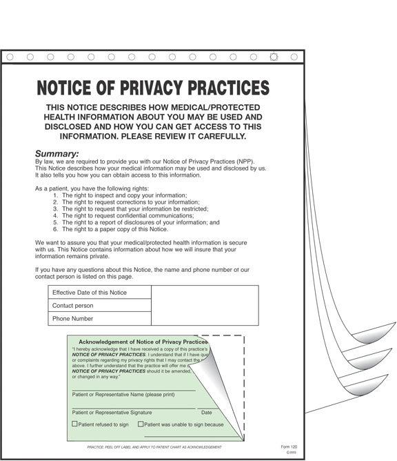 WRITTEN NOTICE OF PRIVACY PRACTICES MUST BE PROVIDED TO PATIENTS ON OR BEFORE THE FIRST ENCOUNTER AND TO OTHER PERSONS UPON REQUEST. THE NOTICE NOTIFIES THE PATIENT OF ALL USES AND DISCLOSURES OF HIS OR HER PROTECTED HEALTH INFORMATION. IN ADDITION, THIS FORM HAS A REMOVABLE LABEL THAT PROVIDES PRACTICES WITH A WRITTEN ACKNOWLEDGEMENT THAT THE PATIENT RECEIVED THE PRIVACY NOTICE, AS REQUIRED TO BE HIPAA COMPLIANT.